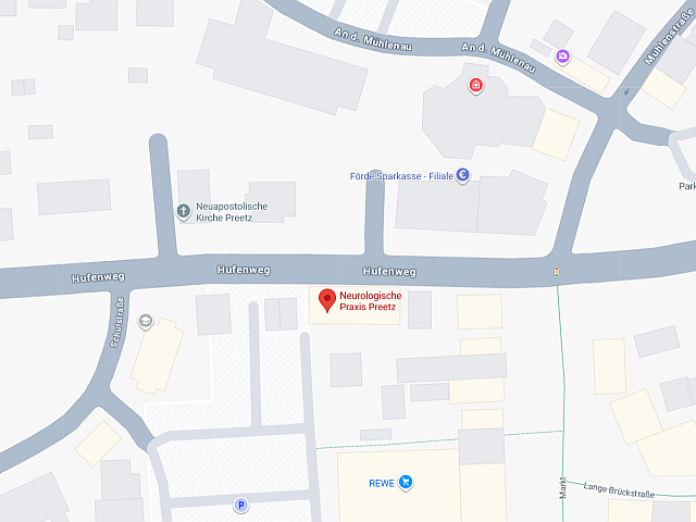 Die Praxis liegt vom nördlichen Ende des Preetzer Marktes aus einmal nach links um die Ecke im Erdgeschoss auf der rechten Seite des Gebäudes Hufenweg 1a.